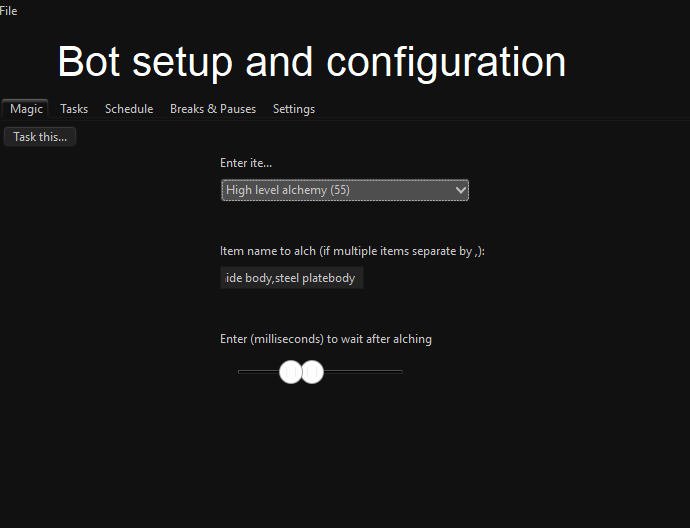 Want to buy with OSGP? Contact me on Discord! Detailed feature list: - Multiple modes: Varrock - Walk to sawmill and bank Varrock - Walk sawmill / Varrock teleport (tablet) Varrock - Walk sawmill / Varrock telkeport (spell) Woodcutting guild - Banks for logs Woodcutting guild - Chop logs Castle wars - Balloon method / Ring of dueling Castle wars - Ring of elements / Ring of dueling POH butler mode Castle Wars - House teleport (Tab OR Spell) / Ring of dueling POH butler mode Camelot PVP - House teleport (Tab OR Spell) / Camelot teleport (Tab or Spell) - Potion support - Normal butler / Demon butler - CLI support for goldfarmers Custom Breakmanager: - Setup Bot and break times - Randomize your break times - Stop script on certain conditions (Stop on first break, Stop after X amount of minutes, Stop when skill level is reached) - Worldhopping - Crucial part to botting in 2023! Script queueing: - Support queueing multiple script in a row - All Khal scripts support flawless transitions in between scripts - Start creating your acc in a few clicks from scratch to multiple 99's - Flawless CLI support - Learn more here: How to use CLI parameters: - Example Usage: -script 463:ScriptFile.BreakFile.DiscordFile SAVEFILE = Saved Filename BREAKFILE = Breakmanager Filename - SAVEFILE: Save file can be created in the GUI. Navigate to the tab you want to run and press "Save As CLI file". Please choose your filename wisely (No special characters) - BREAKFILE (Optional): Breakfile can also be create in the GUI, set the breaksettings you wish to use and press "Save new CLI BreakFile". Please choose your filename wisely (No special characters) - Final form (Note that with some bot manager you do not need to specify '-script 844'): -script 844:TaskList1.4515breaks (With breaks) -script 844:TaskList1.4515breaks.discord1 (With breaks & discord) -script 844:TaskList1..discord1 (NO breaks & discord)1 point