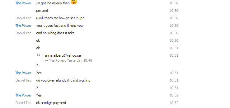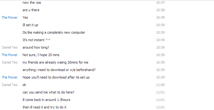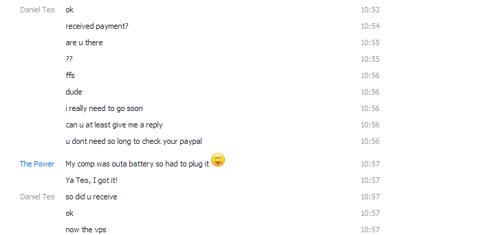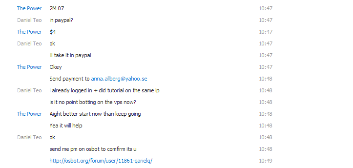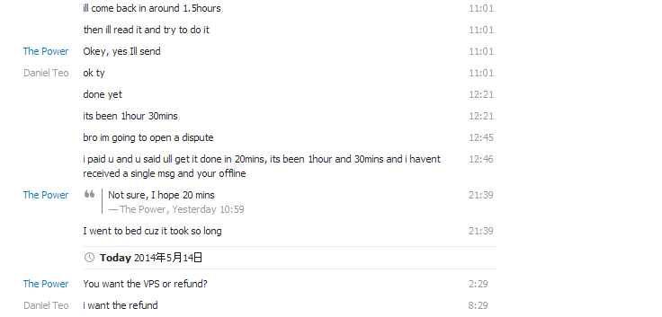 As forums were rolledback, I had to post this again. Disputed member: Softarn Thread Link: http://osbot.org/forum/topic/47857-%E2%99%9B-sofarns-vps-shop-%E2%99%9B-from-4-monthly-%E2%99%9B-100-uptime-%E2%99%9B/ Explanation: He said he would sell me a VPS and teach me how to set it up etc in 20mins. After I sent him the money in paypal, he started taking so long to reply on skype, and he eventually just went offline. After I opened this dispute, he claimed that he was "sleeping". Something fishy is going on and I think that he was planning on scamming, then deciding later that it was not worth it to scam me for 4USD. Anyhow, I expect a full refund to be given. Evidence: Starting of the convo: To comfirm its indeed him on skype, I asked him to pm me osbot, which he did: Shows him comfirming that i paid him on paypal and him promising it will be "fast" and in 20mins, 12hours to get him to reply to me after i paid him is hardly "fast": Him replying 9 hours later and I still have not received a single shit after I paid him: All evidence have been given, I'll let the mods decide if it was a case of poor customer service or he was simply wanted to scam me but changed his mind after. This deserves a TWC at the very least. and this guy shouldn't be allowed to do service on this forum anymore when he shows such poor attitude to his customers, taking the payment and just logging out of skype, and claimed they were "sleeping". I will be leaving a negative feedback. And I want a refund from him as I no longer want anything to do with him .