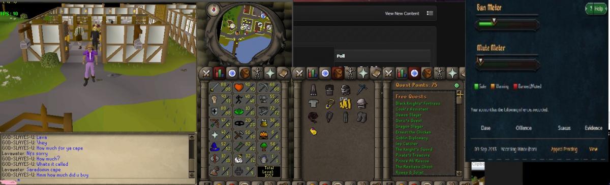 I would like to know how much this account is worth, both RSGP/PP equivalent- Thank you. ------------------------------------------------------------------------------------------------------------------------------- It has done all F2P quests as well as Monkey Madness/HFTD/The Lost City/many others- Minor ban (for 2 days) for Macroing- It comes with Full void (Melee/Range)/Fighter torso. (Ignore Fury and other)-