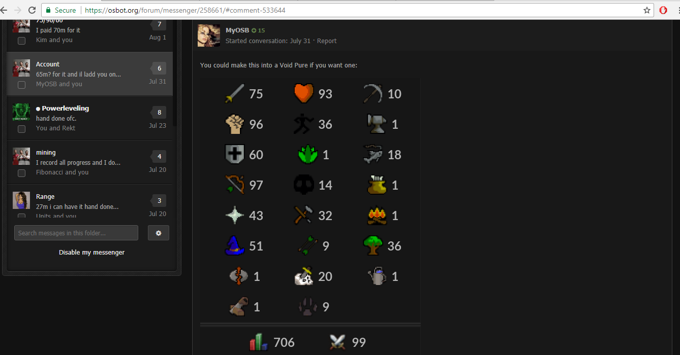 Disputed member: [member=] @MyOSB Thread Link: There are no thread Links because the convo started in a private message. Explanation: I had asked the community for a pure account of some sort at the time and I had gained many offers about accounts and he messaged me through private messages saying he had an account for sale which i was interested in, So after talking about the account in private messages we took it to skype and I had even used a middleman for the whole situation we came to the conclusion of 62m/$70 USD and had a middle man to help us which he did. so after we finished the whole trade etc, i bought gold on the account and leveled the account to 99 range and got the stats up and quests completed and then just yesterday he Recovered the account back. So I am requesting a dispute against him as he wont even respond to my messages anymore. Evidence: I have attached all the Evidence to the dispute. Also I have @Chris for proof.
