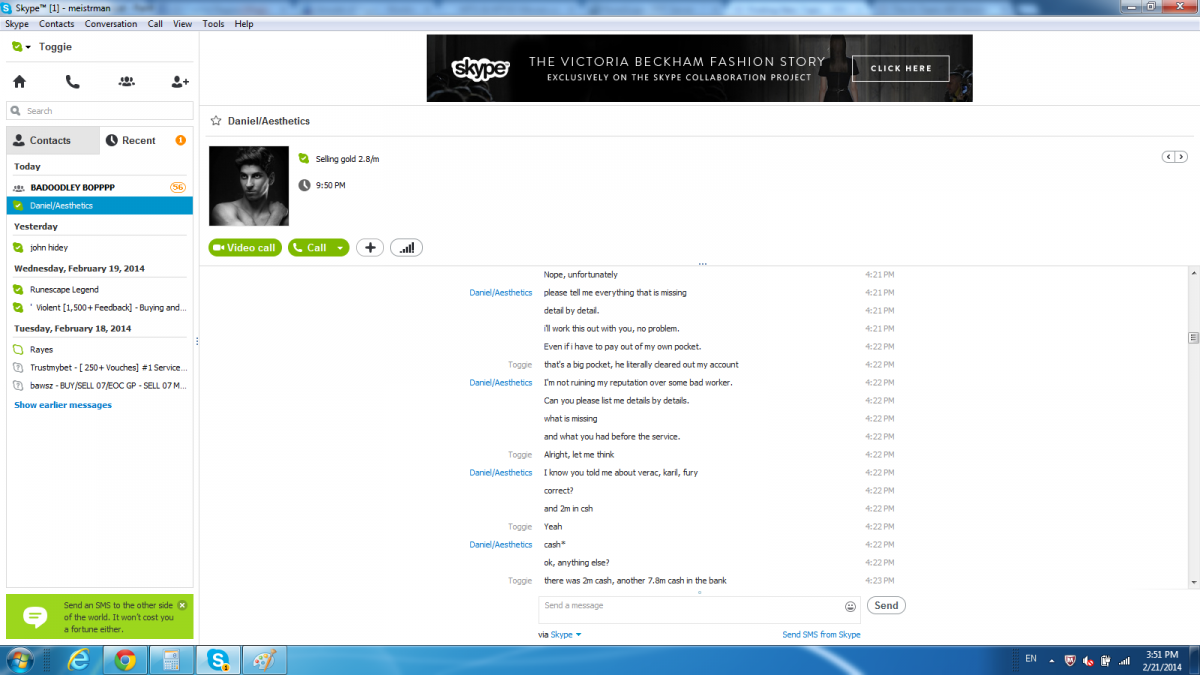 I bought a firecape service from Aesthetic, Jad only. I gave my Username and Password to him on Skype, name Rambo.specs. His worker failed the Jad then stole approximately 66.2m worth of wealth off my account. I have screenshots of Aesthetic claiming responsibility for the theft and saying he shouldn't have trusted the employee. Over the last 72 hours I have been led around with the promise I would get 60m back from him, which each time we came close to transfering the gp I was given an excuse as to why he couldn't do it. I have the entire transcript of our Skype conversation and will happily provide it.