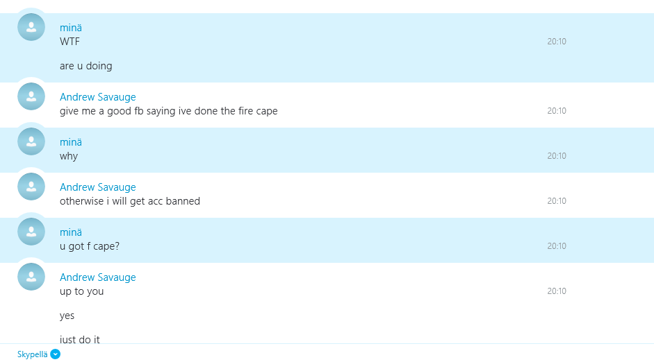 Disputed member: World Thread Link: http://osbot.org/forum/topic/38420-worlds-fire-cape-services-1st-service-free/#entry428282 Explanation: I told him my pass and bank pin, any way said do fcape after few hours this guy gonna send me this style messages (pics on Evidence: section), i give pin too cause my bank is after ashop scammed me yesterday only 1-2m. Evidence: There is some pics what we pmed together, if you need more say?