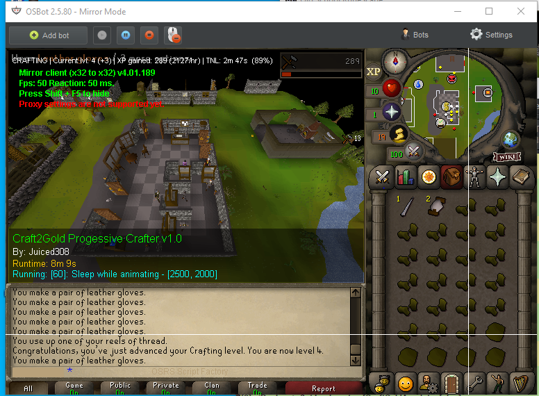 Juiced308 Posted April 6, 2021 Posted April 6, 2021 (edited) Progressive Craft 2 Gold Created by Juiced308 Craft 2 Gold Progressive Crafter Description Progressive f2p Crafting script. Uses Edgeville furnace to gain 1-43 Crafting levels. Progressive Crafting levels Leather gloves, lvl 1-5 Gold rings, lvl 5-6 Gold necklaces, lvl 6-8 Gold Amulet (u), lvl 8-20 Sapphire Rings, lvl 20-22 Sapphire Necklaces, lvl 22-24 Sapphire Amulet (u), lvl 24-31 Emerald Amulet (u), lvl 31-40 Ruby Necklaces, lvl 40-43 Set up Start in Edgeville bank. You will need 2 Needles; 6 Thread; 29 Leather; 815 gold bars; 175 cut sapphires, 320 cut emeralds, 175 cut rubies; 2x amulet moulds, 2x necklace moulds, 2x ring moulds. Note:The extra needle and jewelry moulds are needed in case the bot withdraws one and gets caught in a loop check. Having extra in the bank will autocorrect itself. Observations: Overall it gets the job done. I have successfully leveled three accounts to level 43 using this. All together the supplies come with a hefty price tag of 431,323gp at the time of this posting but crafted items will sell for around 460k when finished. The idea is that most if not all costs will be recooperated. I’d say it's 95% flawless, but be sure to babysit for a couple of minutes! Enjoy everyone!! Future plans - Add function to purchase crafting materials from GE. Updates 1.0 -Updated script to complete levels 1-5 using leather gloves. 1.1 - Fixed a bug encountered within the transition from Crafting Leather Gloves to Crafting Gold Rings 1.2 - Fixed a bug encountered with crafting Gold Rings Progress Reports Edited May 25, 2021 by Juiced308 2 1