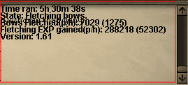 Looks like it doesn't log out if your run out of bow strings. :s Other than that, still running really solid besides clicking knife and logs a few times. Can't say thanks enough Anon! smile.png